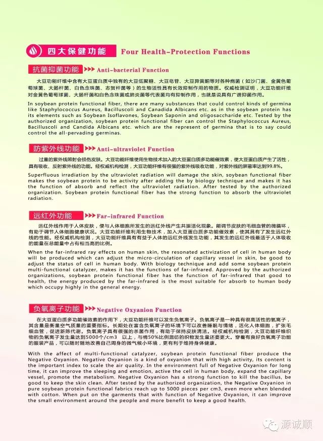 大豆蛋白纖維含大豆蛋白質(zhì)與皮膚親和力好,手感柔軟,吸濕導(dǎo)濕性好,特別適用于針織內(nèi)、外衣產(chǎn)品,纖維中含有抗菌劑,具有保健衛(wèi)生功能,在高檔針織內(nèi)衣領(lǐng)域已顯示較大的開(kāi)發(fā)前景。