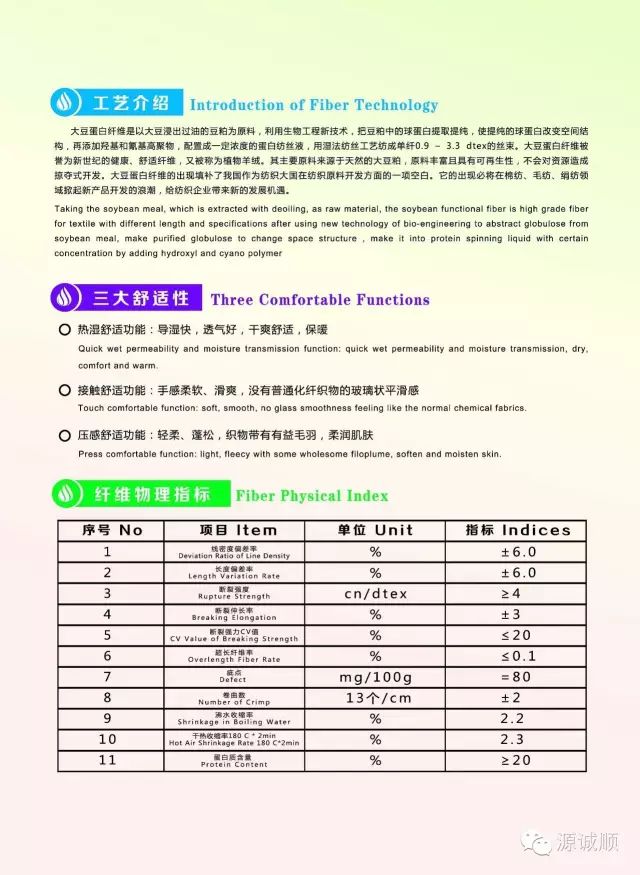 在成為纖維之前,要從大豆中提取蛋白質(zhì)與高聚物為原料,采用生物工程等高新技術(shù)處理,經(jīng)濕法紡絲而成。這種單絲,細(xì)度細(xì)、比重輕、拉伸強(qiáng)度高、耐酸耐堿性強(qiáng)、吸濕導(dǎo)濕性好。優(yōu)于羊絨的手感,光澤能與蠶絲相媲美,棉的保暖性和良好的親膚性等優(yōu)良性能,被譽(yù)為“新世紀(jì)的健康舒適環(huán)保纖維”。